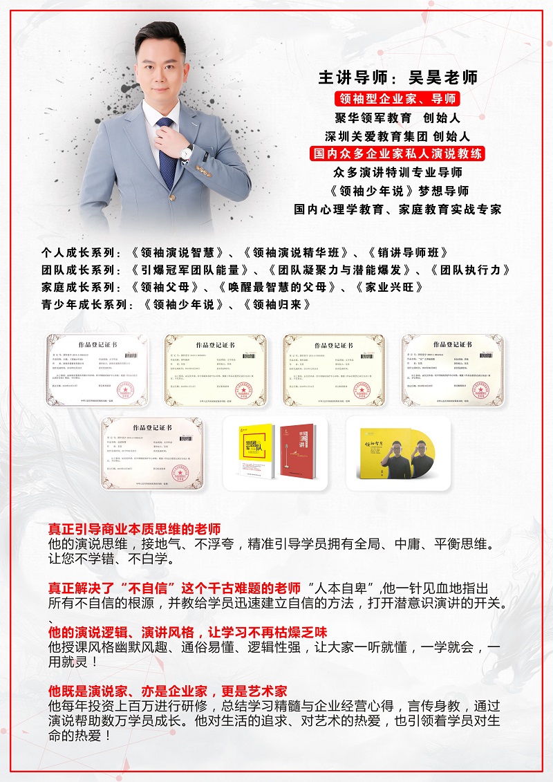 自2007年起吴昊老师创办汕头聚华领军商学院,从一家无人知晓的企业成为业界的翘楚,专业服务潮汕企业超过8年时间,让众多企业从杂乱无章的管理到井然有序的规划发展,将散漫自我的团队打造成有凝聚力、有目标的士气团队,让企业从内到外发生质的落地飞跃,快速高效发展。吴昊老师不愧是讲师中的企业家,企业家中的讲师,既会讲课又会做企业的人才唯有吴昊老师。