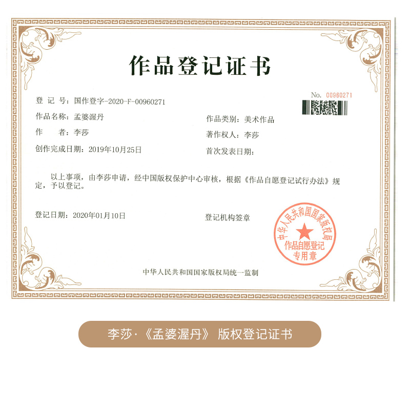 希达文化向来都重视作品版权的保护,而这些作品作为李莎老师的经典之作,并于2020年1月10日登记,经中国版权保护中心审核,其文字作品《孟婆传奇》、《<孟婆传奇>故事大纲》获得了国家版权局颁发的《作品登记证书》,登记号分别为:国作登字-2020-A-00960295、国作登字-2020-A-00960285。美术作品《孟婆渥丹》也获得国家版权局颁发的《作品登记证书》,登记号为:国作登字-2020-F-00960271。