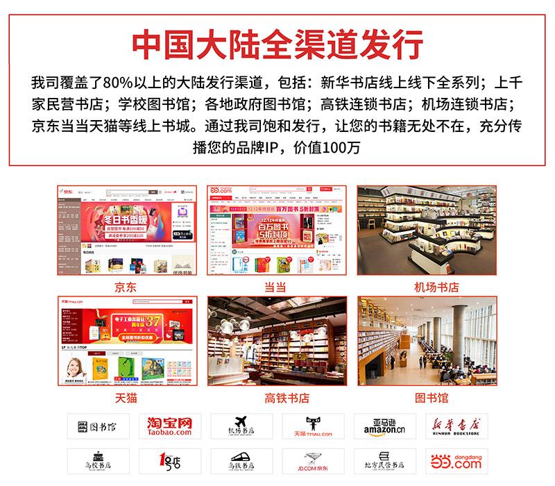 众所周知,书店、图书馆是书籍最好的容所。一般读者获取书籍的渠道都是来自于书店或图书馆中。将书籍放置于书店或图书馆中,不仅能够找到忠诚的阅读者,还能增强图书的权威,赢得更多读者的信任感。当然在互联网盛行的时代,网上书店也是众多阅读者青睐的购书渠道,出书大师网精准选择了当下最为热门的京东、当当和天猫等电子商城作为图书上架推荐平台,建立有效的网上营销渠道,提升图书销量。