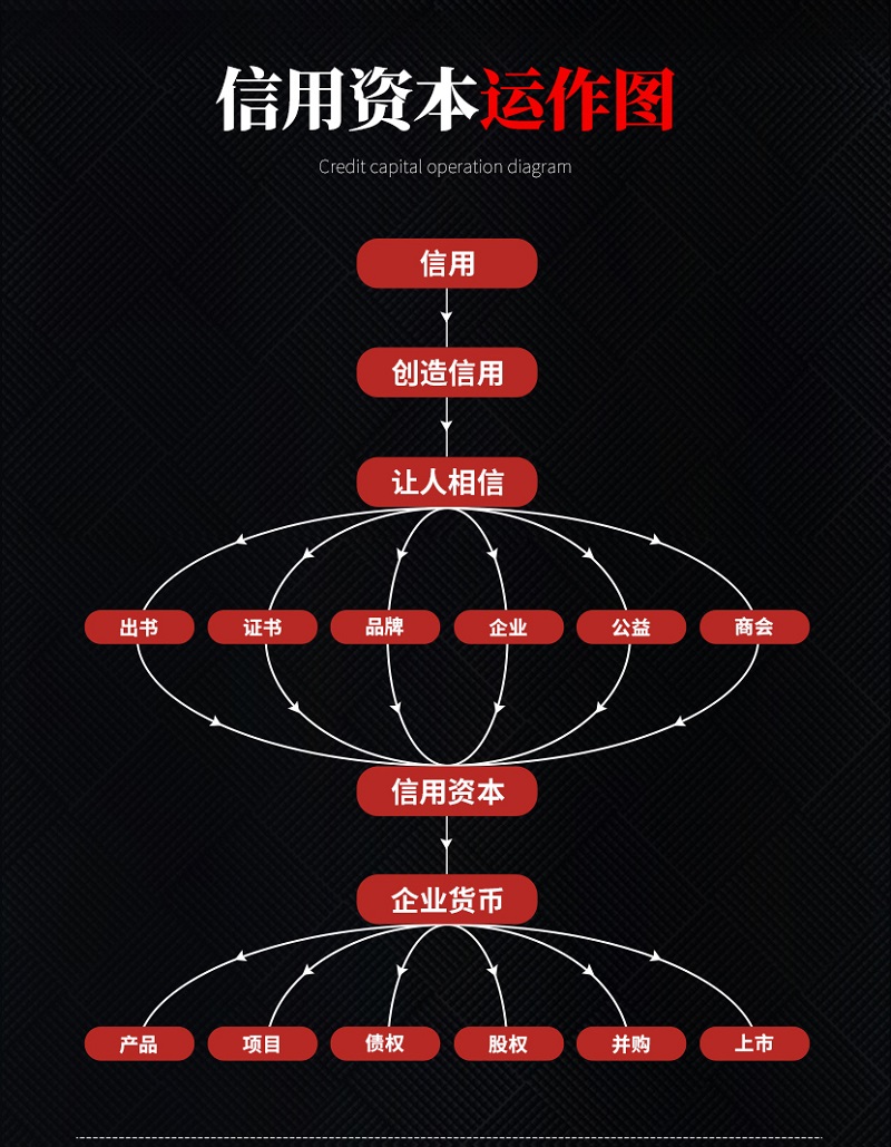 基于庞大的信用资本积累,出书大师网能够将信用资本逻辑抽丝剖茧,将企业发展的运作模式一一展示。从图的上方开始,信用主体拥有信用,也就是财富资本,可以进一步创造信用,目的就是使人相信,让人相信有多种实现途径,出书证明、证书证明、成就品牌、做企业、做公益、聚商会,而这些途径当中,出书无疑是产生效益最直接、最快速的方式。通过各种形式进一步获得信用资本,这些资本创造出了企业货币,形式同样多样化,包括产品、项目、债权、股权、并购、上市等,最终为企业的发展奠定了坚定的基础。
