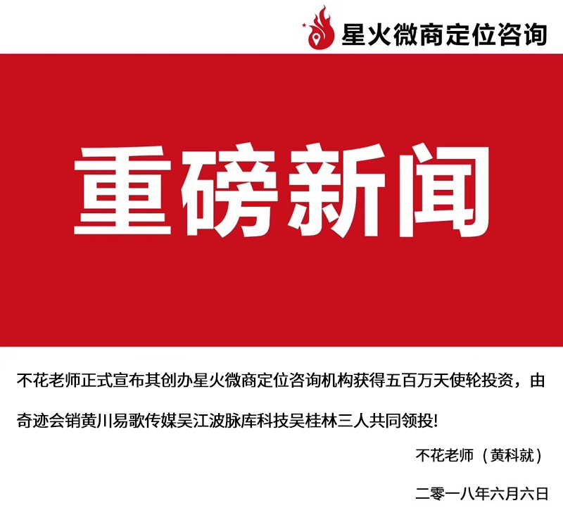 只要是金子,不管在哪里总会发光的,不花老师创立微商定位公司不久,就凭借着先进的经营理念和出色的个人管理能力赢得了投资人的认可,获得一笔五百万投资,由奇迹会销黄川、易歌传媒吴江波、脉库科技吴桂林三人共同领投,这给了不花老师极大的自信力,使他的职业生涯进入一个新的春天。与此同时,出书大师网也给不花老师传来一个好消息,其新书《IP时代:从零开始打造超级IP》正在出版流程中,相信很快就能和读者粉丝们见面,里面关于微商品牌的打造,在知识层面上面面俱到,具有很强的可操作性。双喜临门,相信不花公子扶摇而上,成为微商领域的行业新巨头不远矣!