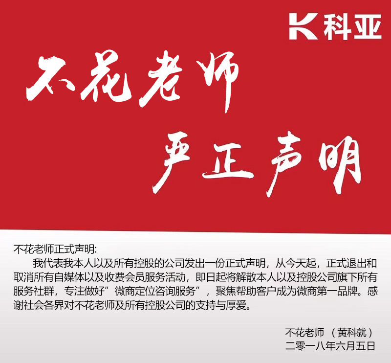 作为清华北大最年轻的特聘导师、知名的科亚社交电商大学创始人,不花老师在微商领域有着丰富的专业知识和实际操作经验,凭借着灵敏的市场嗅觉,不花老师慧眼如炬,经过多年的专业剖析和市场积累,不花老师十分看重微商行业的未来发展前景,权衡利弊之后决心全身心投入打造微商行业的标志性代表,实现自我价值品牌的传播,并建立有效的粉丝群体,为此特作出以下正式声明。