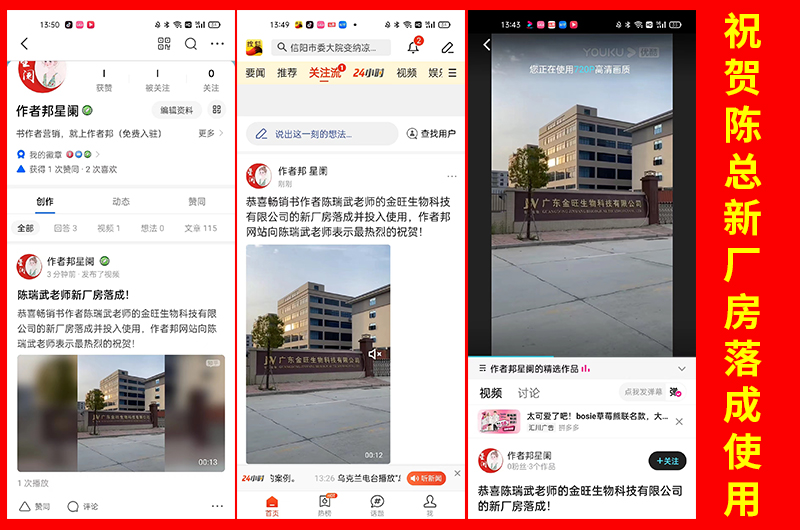 作者邦网经纪人,更向陈瑞武老师以及广东金旺生物科技有限公司新厂房的落成等,送去了真挚的祝贺和祝福。这既是对金旺生物科技的极大关注、信赖、支持以及祝愿,还是作者邦网经纪人耐心了解、用心专注并周全关注入驻会员的服务体现,更是广东金旺生物科技有限公司事业进步的较好展现。这,也必将为多方步入共赢、多赢局面所表现出来的新景象、新气象!