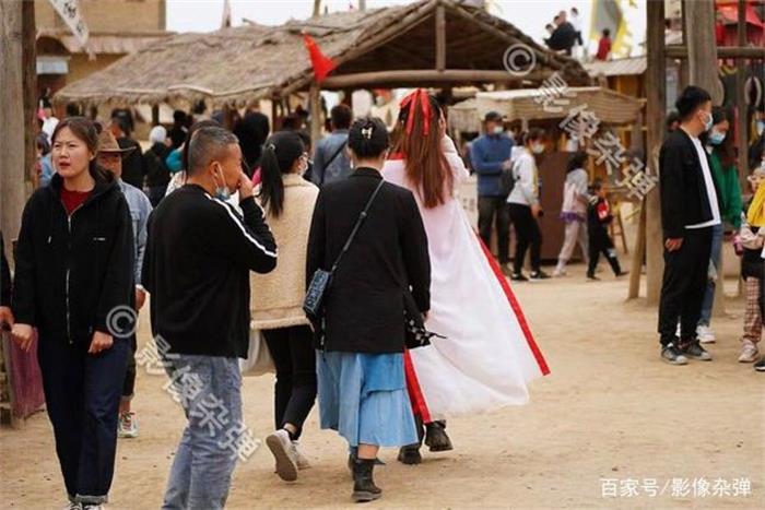 正值国庆假期,宁夏银川镇北堡西部影视城游客爆棚,而那些穿着红色裙子的紫霞仙子也成了一道亮丽又独特的风景线。