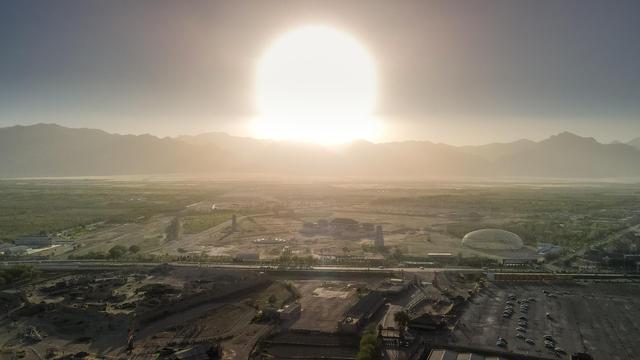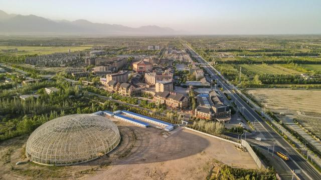 航拍下,看看回银川的公路在横跨于此,我们是去贺兰山看完崖画,再到影视城参观的。