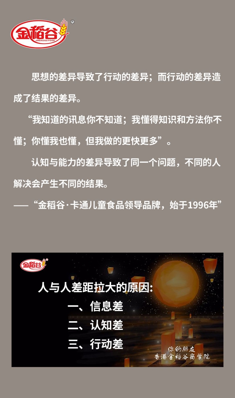 在这些格言当中,它们涉及了品牌成长的目标、初心、处世、人品、勇气以及差异等维度。这些智慧指出,品牌的发展需要有自己的发展目标和战略,需要有奉献社会的责任担当之初心,需要有恰当和分寸得度的处世关系,需要有正直良善的人品,需要有勇往直前的勇气以及思想认知上的差异与高度等。这些智慧思想,便是金稻谷在二十多年风雨中稳步成长的秘诀。