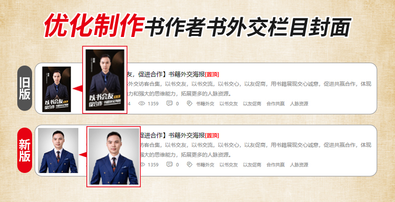 作为壹本教育创始人和作者邦网入驻书作者会员,程鹏老师的个人信息、动态和资料等,都在作者邦网专属页面上得到了聚合展示和网络传播。其中,书外交海报相册作为其专属页面的主要组成部分,很多时候展现了程鹏老师的形象力、影响力和传播力。而书外交相册专栏封面,作为该栏目的窗口与形象展现,对于其魅力传播和形象传递,起到了非常关键的作用。近日,作者邦网为程鹏老师的书外交栏目封面进行了改版升级优化。
