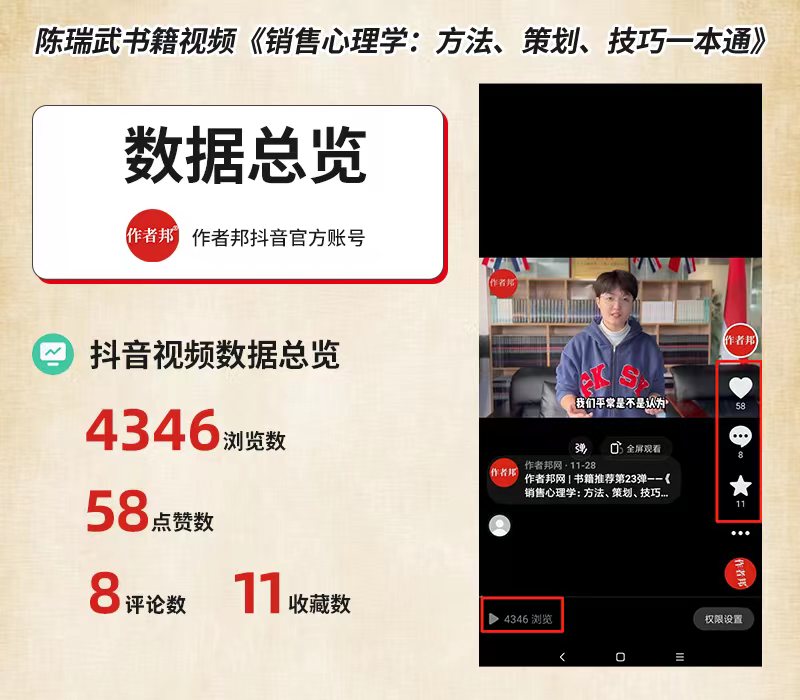 通过作者邦网抖音等官方视频账号的上限、传播和展示,陈瑞武老师的《销售心理学》书籍推荐视频,很快就获得了网友的认可和传递。视频,更在较短时间内收获了良好的传播指数和影响力指数。通过视频推介,我们可以更直观、形象而又简洁地了解陈老师的这本《销售心理学》,并且能够在较短的时间内读懂了这本书籍作品的主要内容概况。而且,这本书籍的介绍,更以广大网友喜闻乐见的方式,进行了品牌力的传递和传播。