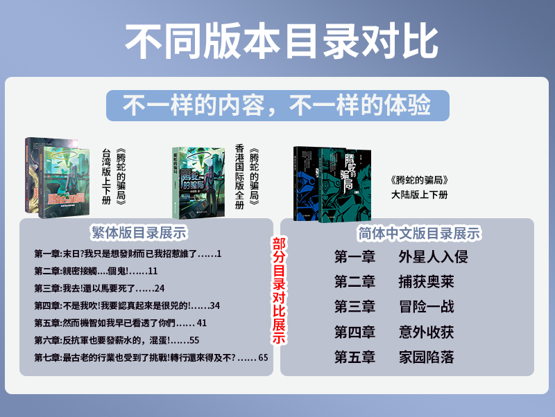 米高猫(本名张公辅)老师的著作《腾蛇的骗局》,近期推出了由金城出版社全新出版的大陆版上下集。引起了不少读者朋友的关注和支持。在这部大陆版上下集《腾蛇的骗局》上线国内各大图书销售平台的同时,它的其他版本也引起了广泛的关注。事实上,这部著作近年来也同时出版了台湾版和国际版。在海外市场火爆热销,受众多科幻书迷们的喜爱。相对于大陆版来说,繁体版本未删减的完整版,拥有更多值得大家阅读和鉴赏的精彩。下面,笔者就这几个版本的异同等,做下相应的总结,以供读者朋友了解。