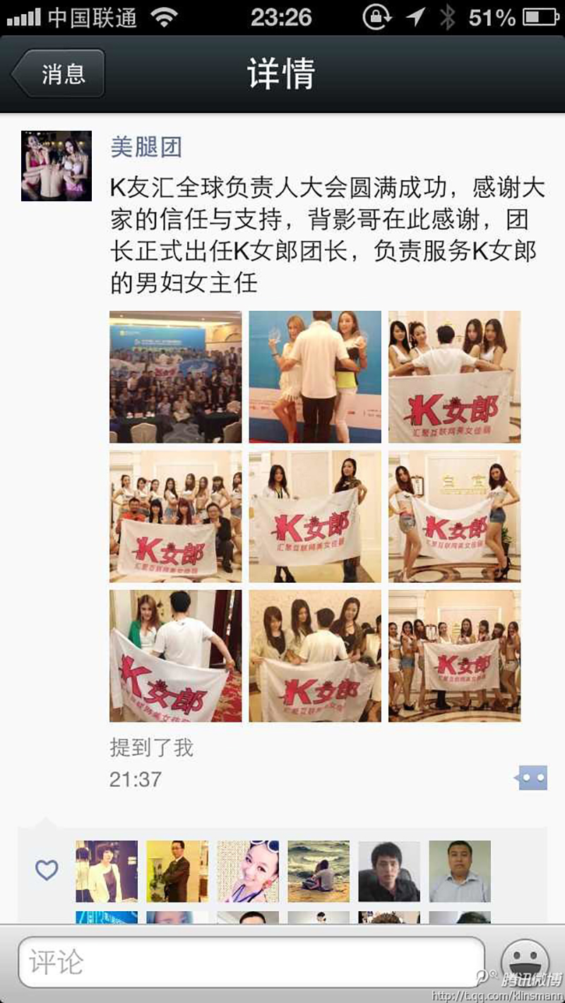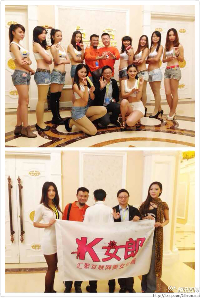 青龙老贼作为K友汇的总顾问和微信界的牛人,得到了大家的广泛热捧,他也在场表示会全力支持K友汇的各项发展,宣传K友汇。K女郎的团长背影哥是最让大家羡慕的人,他每天和不同的美女用背影合影,惹得众人艳羡。不过他对K友汇的感情非常深,还表示通过K友汇的平台已经得到了投资,很是感谢。他用着一段非常流利的段子给大家介绍了对K友汇的看法,其中把K友汇比喻家园、比喻避风港,让大家感触颇深。他也承诺,会把K女郎的大旗找1000位美女来签名,收集1000张和K女郎的合影。站长红人郭吉军分管全国各地的K女郎群,他希望各地负责人可以多组织活动,为当地的美女介绍模特业务等。鑫泰文化的董事长吴学军先生作为宣传顾问,现场播放了K友汇的宣传视频和让众人捧腹的《球哥囧事》,还表示后期将陆续到全球各地的K友当地邀请当地的K友拍摄微电影,而全球K友汇微电影计划也正式现场宣布启动。另外一个顾问张权威是薄荷时尚的创始人,轰动一时的胸媒体就是他和郭吉军的杰作,他也为寻找各地K女郎贡献了自己的重要力量。因故未能到场的80年代和吴克清也会作为顾问团队陆续更多的为K友提供支持。