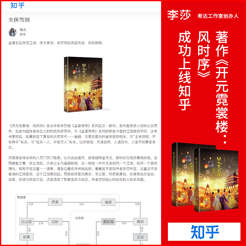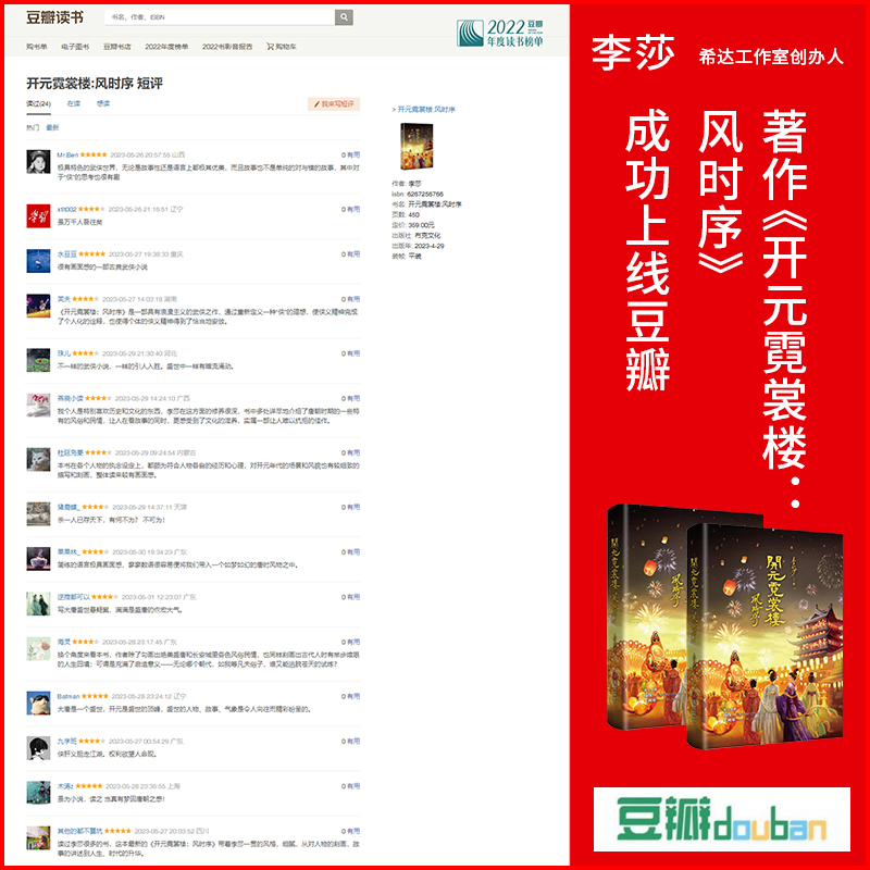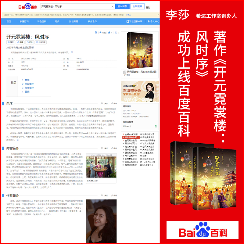 近日,由布克文化出版、李莎老师创作的新书《开元霓裳楼:风时序》,正式上线百度百科、搜狗百科、知乎以及豆瓣等平台,诠释其独特而富有魅力的品牌实力。