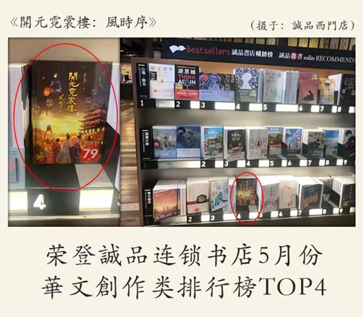 金石堂书店和诚品书店是台湾的老牌书店,其中金石堂作为台湾目前最大的连锁书店,在台有91家分店。据悉,该书目前获得金石堂双周排行榜,华文文学榜单第1名的成绩。在诚品书店5月份的华文创作类排行榜中,也取得了TOP4的优秀排名。