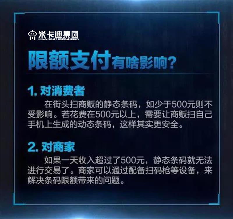 由于静态条码(如事先贴在墙上的二维码)易被篡改或变造,易携带木马或病毒,央行规定,使用静态条码进行支付的,风险防范能力为D级,无论使用何种交易验证方式,同一客户银行或支付机构单日累计交易金额应不超过500元。例如,消费者在使用微信钱包扫描静态条码支付时,单日使用零钱包支付的上限不超过500元,同时微信关联的所有银行卡还可以再独立获得500元的支付上限。