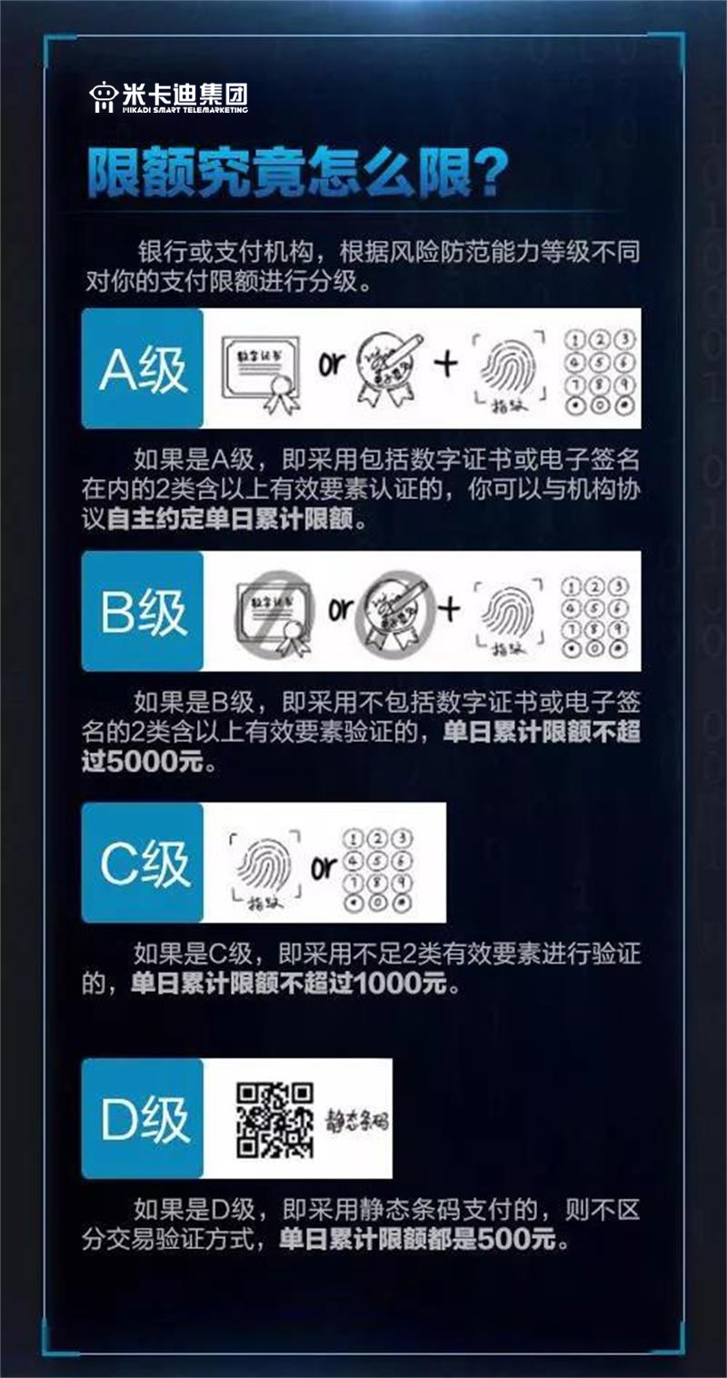 对于使用动态条码(如手机上实时生成的条码)进行支付的,风险防范能力根据交易验证方式不同分为A、B、C三级,同一客户单日累计交易限额分别为自主约定、5000元、1000元。