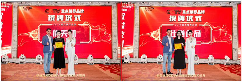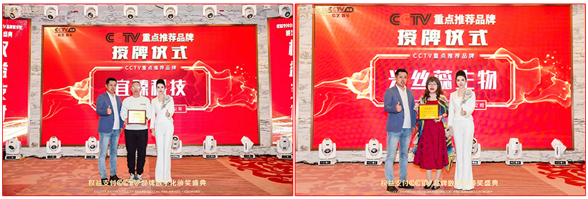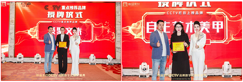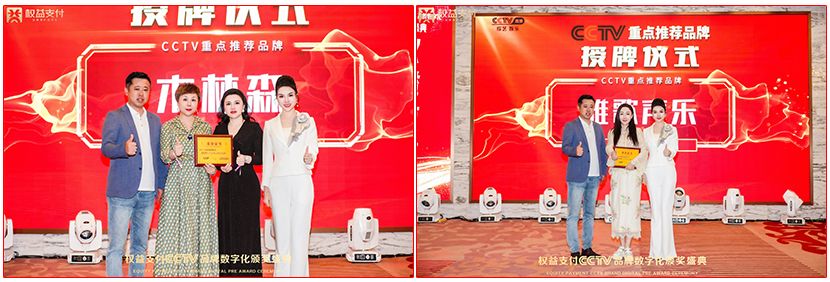 本次在权益支付CCTV品牌数字化颁奖盛典热烈恭喜木林森健康科技荣获CCTV栏目重点推荐品牌奖,热烈恭喜雅歌声乐艺术中心荣获CCTV栏目重点推荐品牌,热烈恭喜聚聚文旅集团荣获CCTV栏目重点推荐品牌、热烈恭喜伊芙林养生馆CCTV栏目重点推荐品牌、热烈恭喜自主艺术健康数字美甲CCTV栏目上榜品牌、热烈恭喜濠河人家餐饮CCTV栏目上榜品牌,热烈恭喜雪长生品牌CCTV栏目重点推荐品牌,热烈恭喜深圳钰熹翡翠珠宝有限公司CCTV栏目重点推荐品牌,热烈恭汕头市宜臻科技发展有限公司CCTV栏目重点推荐品牌以及热烈恭珠海市兴丝蕊生物科技有限公司CCTV栏目重点推荐品牌,还要恭喜CCTV年度最具影响力人物奖获得者:宁雅静、曾娜、杜华、付海漫、沈国梅、周小芬、邱凤玲、王宝珍、刘家淇、黄悦意。以上获奖品牌以及获奖人物,均由CCTV高清娱乐综艺频道主任李俊东先生和CCTV点亮中国好品牌栏目发起人李艺凡老师代表CCTV栏目颁发奖牌。