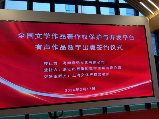 上海文交所、海南奇遇文化有限公司与浙江出版集团数字传媒公司签订了《仓颉计划:太湖禁地》《唐门:疾风令》作品的有声数字版权合作协议。以上两部作品经“全国文学作品著作权保护与开发平台”登记后,成功由上海文交所组织交易,未来将成为平台有声转化作品上线。