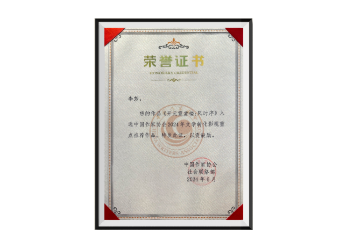 近日,由李莎老师创作的书籍《开元霓裳楼:风时序》入选中国作家协会2024年文学转化影视重点推荐作品,并获得了中国作家协会颁发的荣誉证书。