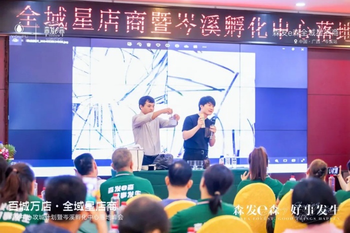 随后,现场进入了森发e森洗发水的实验环节。这款洗发水凭借其独特的配方和卓越的使用效果,已经在消费者中建立了良好的口碑。实验展示中,杨总和高总通过生动的实验操作,向与会者直观地展示了中药发酵产品的独特性和高效能力,引起了与会者的极大兴趣。
