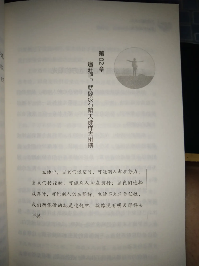 “如果你今天忘了努力,把时间和精力浪费在虚无缥缈的明天,那你就预见明天的生活是糟糕的”。我们都有懒惰的时候,但有的人会一直懒下去,我们总想着今天的事情做不完了,明天还有时间,要不明天做吧,这样我们的事情越攒越多。“你不行动,你的世界就会寸步不移”。所以我们每天都要努力追赶,“就像没有明天一样”。