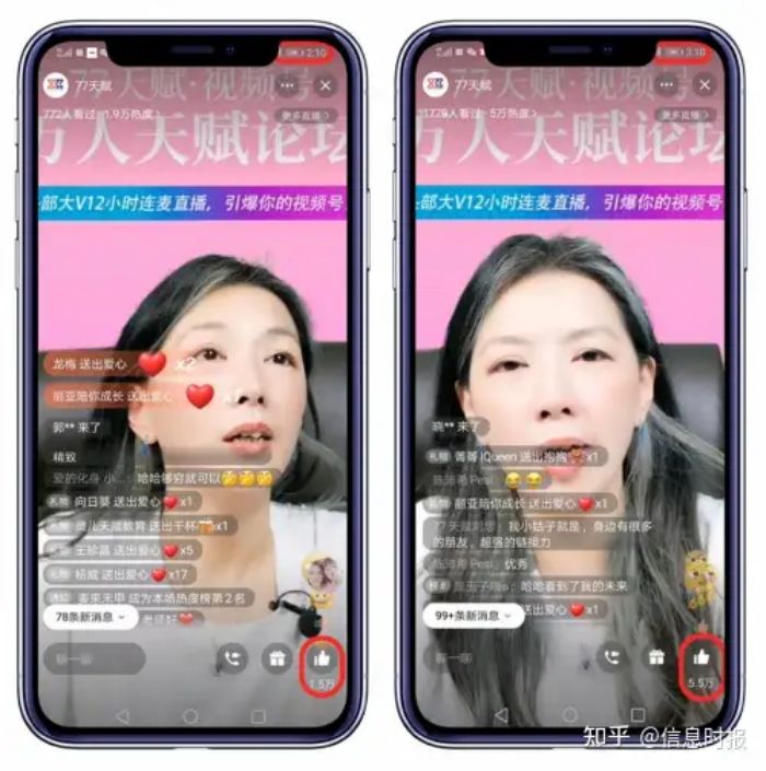 直播一开始,直播间的观看人数就以平均每分钟200人的速度增加,开播不到一个小时,直播间观众人数已经达到了10000+人;当开播10分钟后,直播间的朋友们对77导师的小红心支持已经到达了1.5万,而1小时后,点赞支持量已经有5.5万……由此可见77天赋视频号直播间的火爆程度