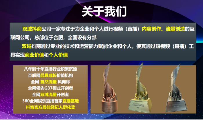 双域抖商公司一家专注于为企业和个人进行视频(直播)内容创作、流量创造的互联网公司。总部位于合肥,全国设有分部 。