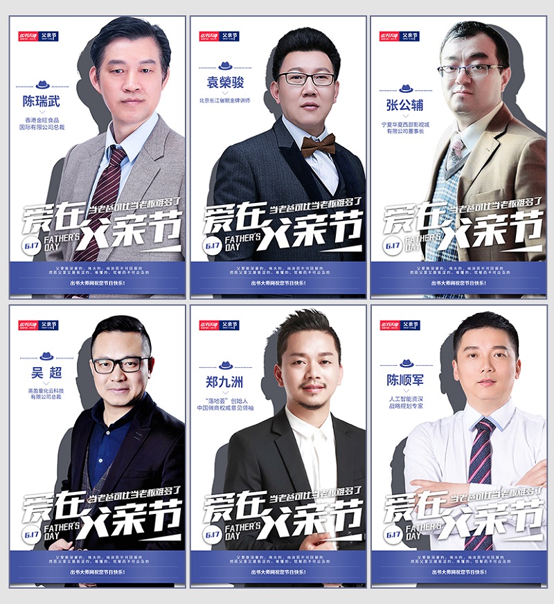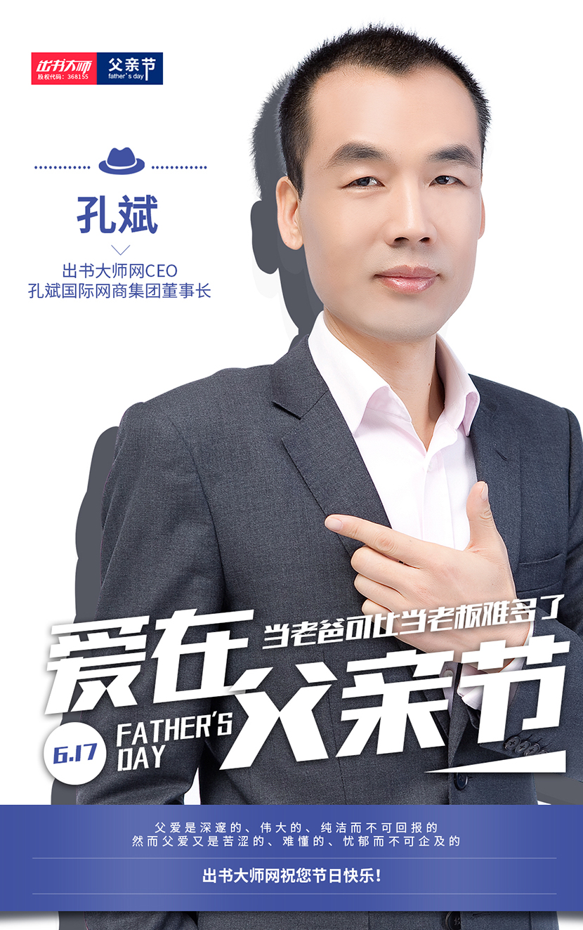 父爱像一本书,里面写满了浓浓的深情与关爱;父爱像一颗糖果,含在嘴里甜在心头;父爱像一把大伞,遮挡前途未知的风雨......父爱是深邃的、伟大的、纯洁而不求回报的;父爱又是苦涩的、难懂的、忧郁而不可企及的。作为一家之主他们是家里的顶梁柱,为家庭的幸福与美满在努力;在公司他们作为领头人是所有员工的衣食父母,为企业的辉煌与发展在奋斗。我们的男神辛苦了!对于出书大师这个擅长策划的团队来说,在Father’s Day这样一个特殊的的节日里,为所有畅销书的男神作者送去父亲节祝福,以这样的方式表达对男神作者们敬意,不得不说是一个很尊重的做法!那么出书大师到底是如何做的呢?