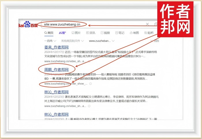 周鹏:奇迹发生,通过作者邦平台发布信息,个人营销网站被百度永久收录并在首页展示,品牌力和影响力的有力证明
