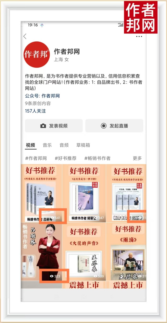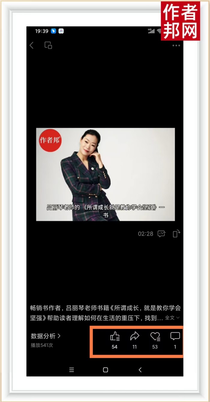 值得一提的是,作者邦经纪人为吕丽琴老师剪辑的书籍视频发布到作者邦官方视频号后,取得了相当不错的成绩。视频的浏览量达到了三百以上,而书籍视频的浏览量更是高达 541。这一数据充分展示了吕丽琴作品的吸引力和影响力。而且,书籍视频的点赞量和收藏量也颇为可观,这表明这些视频不仅吸引了观众的眼球,还得到了他们的认可和喜爱。这些视频就像是一扇窗口,让更多的人有机会了解吕丽琴的作品,进一步扩大了她在文化领域的影响力。