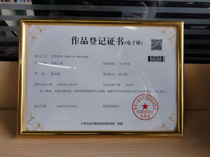 据悉,《无迷之迷》是张公辅先生近年来精心创作的一部力作。该作品以其独特的文学视角和深刻的思想内涵,赢得了广泛的关注和赞誉。此次成功获得版权登记证书,不仅是对张公辅先生创作成果的肯定,也是对其文学才华和创作精神的认可。