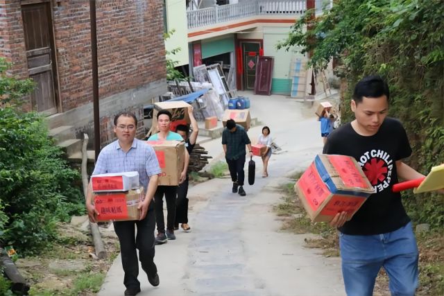 ▲捐赠方代表与上岩完小教师共同搬运捐赠物资