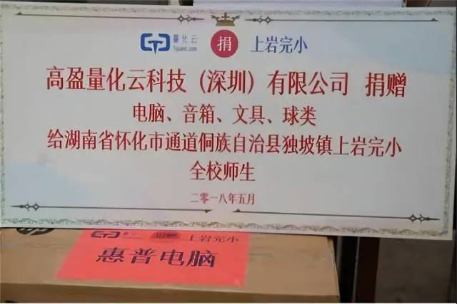 2018年5月18日,“量化云—上岩完小公益助学活动”捐赠仪式在湖南省怀化市通道侗族自治县独坡镇上岩完全小学(以下简称“上岩完小”)圆满举行。高盈量化云科技(深圳)有限公司(以下简称“量化云”)、福州邵武商会、邵武第一中学为此次公益助学活动的联合捐赠单位,上岩完小为受捐单位,深圳硅谷大学城创业园管理有限公司为本次捐赠活动的协助单位。捐赠方代表和上岩完小校长龙宪能、独坡九年一贯制学校校长夏代店、副校长吴农军等受捐方代表及领导均出席了此次捐赠仪式。