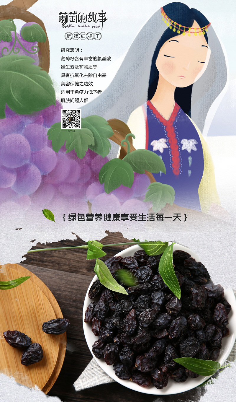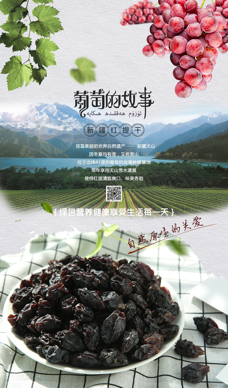 那么作为果中珍品、新疆名片的红提干又有些特殊之处呢?阿克苏地区拜城县,位于北纬41度.背靠天山雪山,海拔1230米,占地12000亩,昼夜温差达15度至18度,种植过程以绿色有机为本,利用天山雪水灌溉,方圆百公里没有工厂和污染,周围是牧场和戈壁沙滩,全年无霜期达到187天,使得这里产出的红提个体大,清脆爽口,味美香甜,糖度非常高在22度至26度之间,颜色呈鸡血红色,品质为上等,经国家农业部食品监督检测中心检验,本基地鲜食红提被认证为绿色食品。不是所有红提都叫拜城红提,这里的红提享誉世界,产地的特殊造就了红提干不同凡响的品质,未来随着一带一路的延伸,这里的红提干会走入千家万户,给大家带来一场难得的饕餮盛宴。