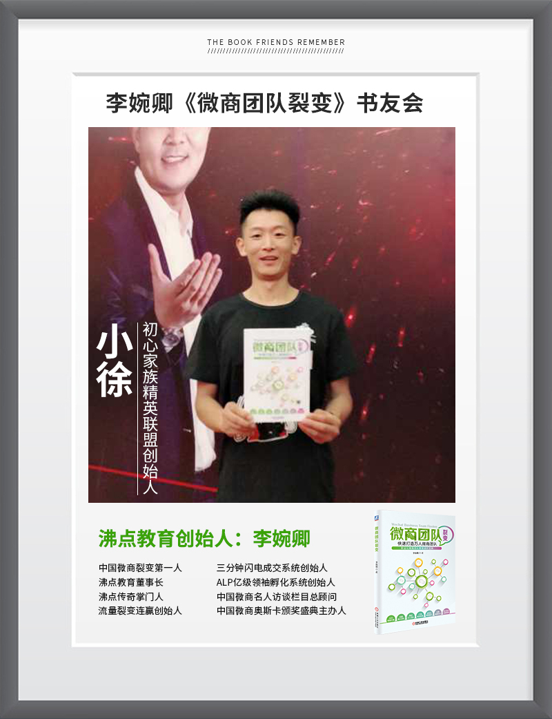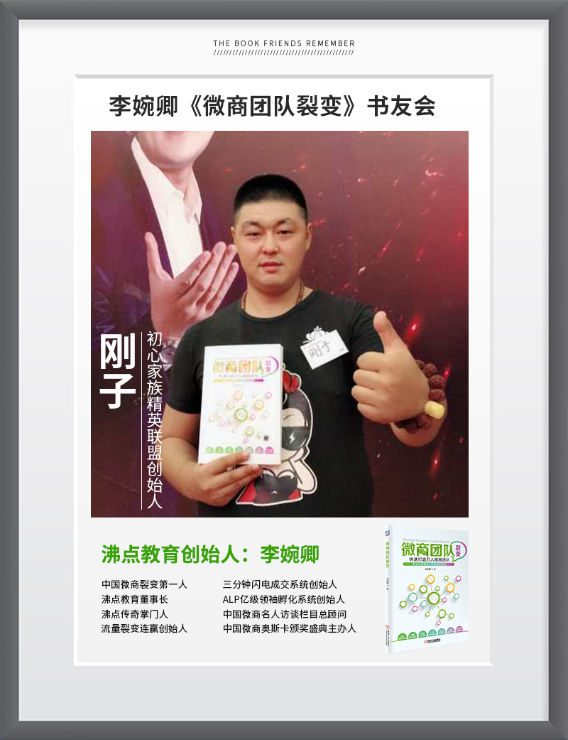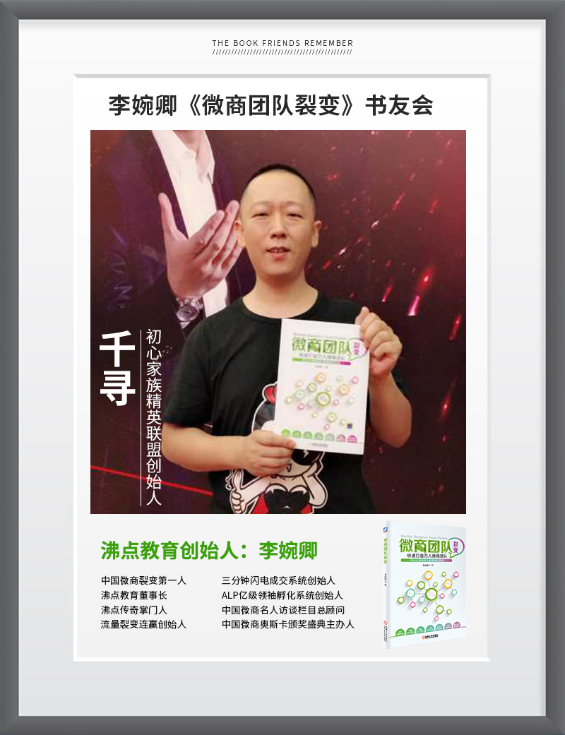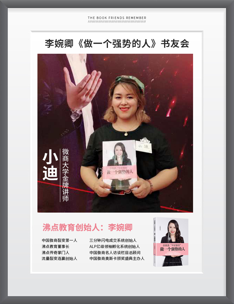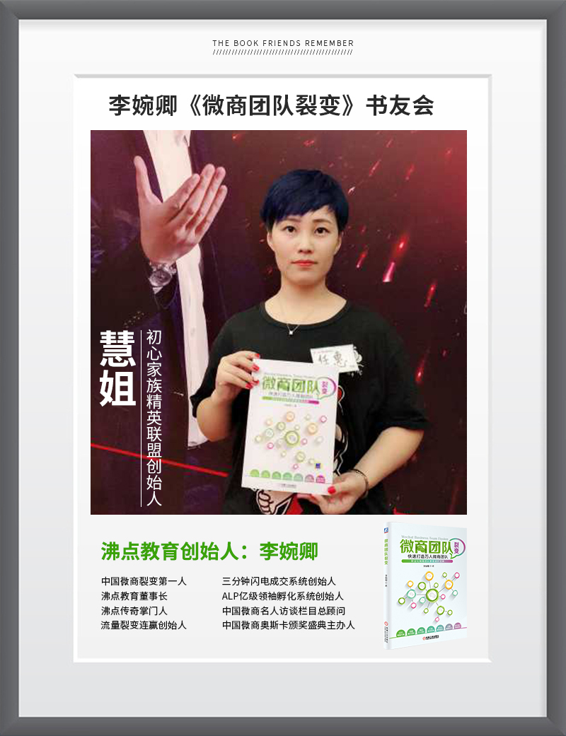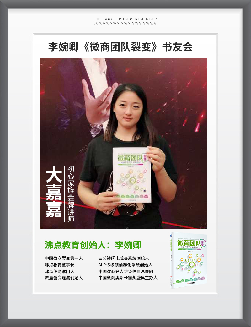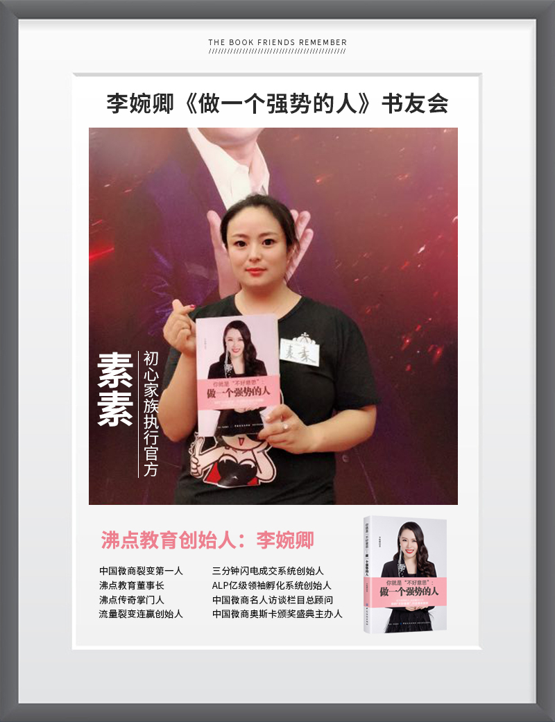 出书大师始终践行“塑造个人品牌,实现财富人生”的承诺。裂变女王李婉卿著作——《微商团队裂变》和《你就是“不好意思”:做一个强势的人》明显受到越来越多人追捧,通过出书,李婉卿老师扩大了自身影响力,与书友合影留恋也成为了一种新的外交手段。