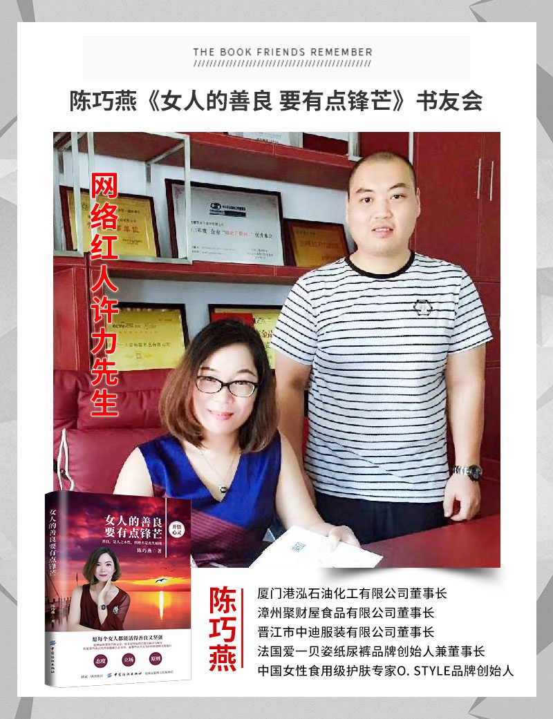 会谈最后,许力先生对陈巧燕老师畅销书作者的身份啧啧称奇,再加上自己平日喜好读书,于是,陈巧燕老师欣然赠送许力先生自己的著作《女人的善良 要有点锋芒》。此书是陈巧燕老师委托出书大师全权代理出版,在网上拥有相当不菲的销售成绩,获得了广大读者的热烈追捧,陈巧燕老师赠送此书也表示自己最美好的祝福,希望二人的事业长虹,期待后续的合作,共创辉煌!