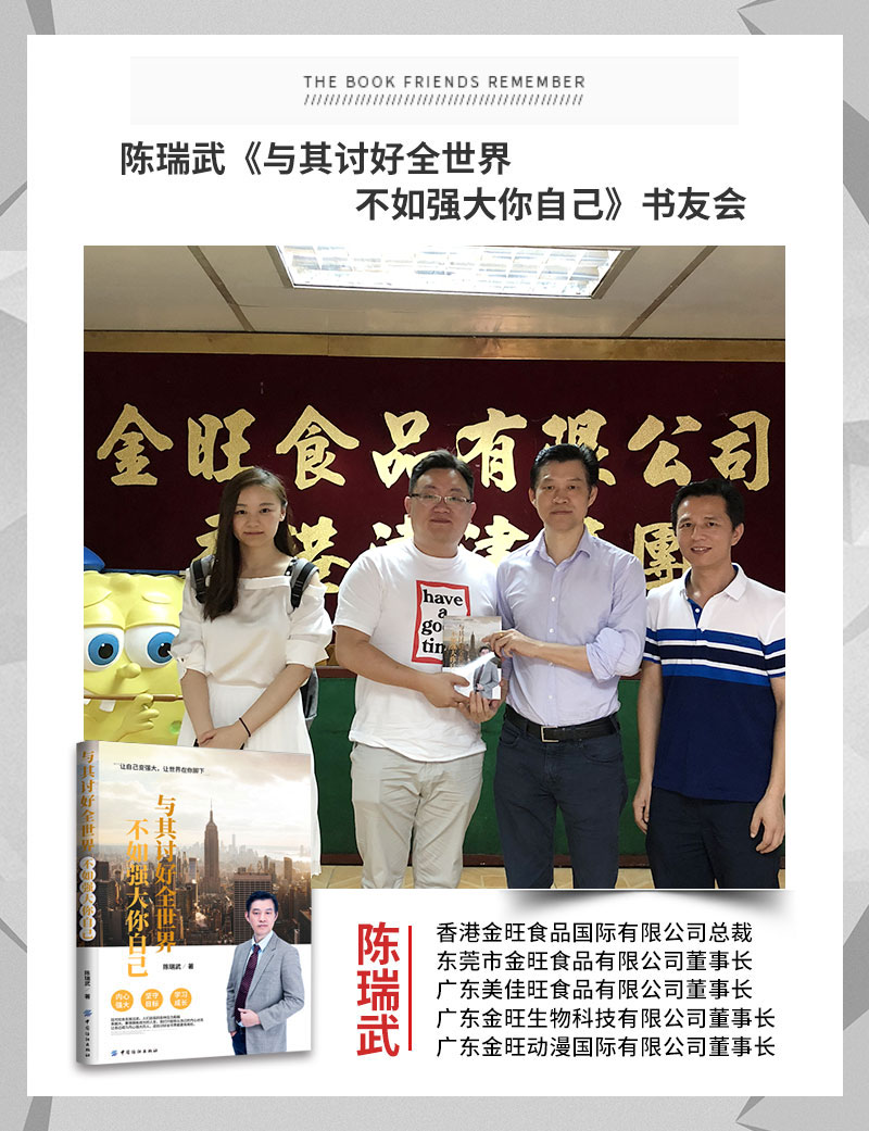 在交谈结束后,姚总听说了陈瑞武老师最近新出了一本著作——《与其讨好全世界不如强大你自己》,就表示想要一睹陈瑞武老师新书的风采,陈瑞武老师主动赠送自己的签名新书给姚总留念。在新书中陈瑞武老师独具匠心的引入了一些风趣幽默的心理学小知识和个人经历,完美的诠释了各种人际关系的问题处理方法,在翻阅了几章之后就开始不断地像陈瑞武老师竖起大拇指,赞叹陈瑞武老师的睿智与幽默,姚总表示自己对陈瑞武老师的新书很感兴趣,并且表示回公司后会向朋友员工宣传!
