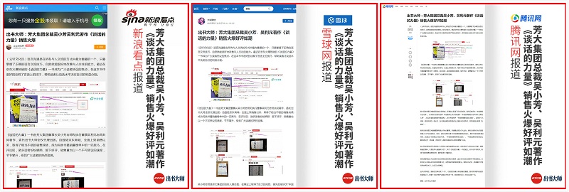 《谈话的力量》能够被权威媒体新浪看点广泛报道一是因为此书火爆的人气基础,二是出书大师的不懈努力追求。出书大师网自成立伊始,便以客户自品牌为中心,以网络推广宣传为己任,旗下更是拥有大量的媒体资源用以进行书籍的全网推广和宣传,与此同时出书大师也始终维持着与多个权威媒体的有效沟通,争取用最好的权威媒体资源,作为客户传播书籍影响力的媒介。