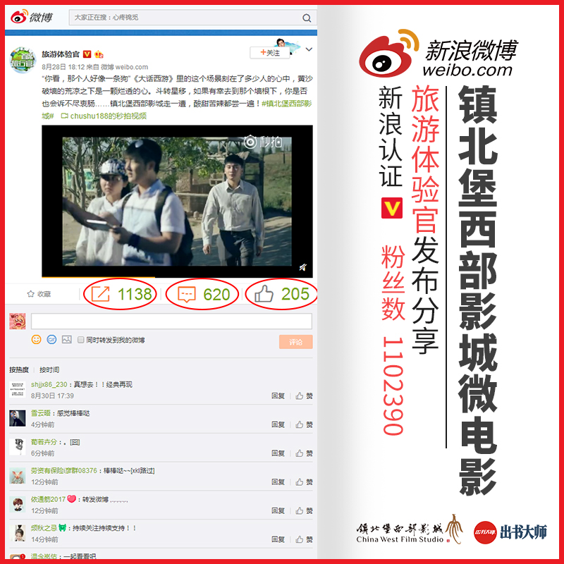 近日,这则微电影由出书大师旗下网媒公司合作伙伴新浪微博著名大V“旅游体验官”分享发布在其微博主页,在短短的时间了就有千多人分享转发,获得了60万 +的播放量。这则影片能够获得如此多人的喜爱和关注,这和镇北堡散发的浓密文化气息息息相关,当然也少不了大V博主在微博平台上的倾力支持。