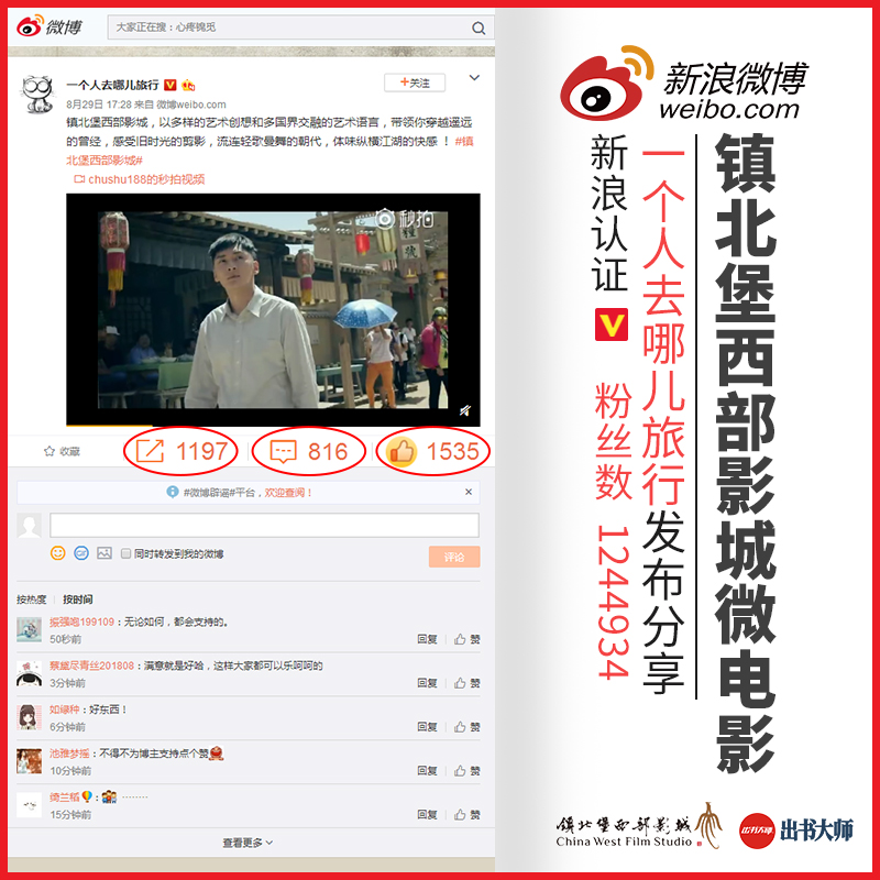 这部微电影由镇北堡西部影城董事长、也是出书大师网自品牌VIP 合作伙伴的米高猫先生自编自导完成,自制作完成后便备受社会各界关注。在近日,出书大师网旗下网媒公司重要合作伙伴,id名为“一个人去哪儿旅行”的著名微博大V在其微博主页上分享发布了此条影片,受到诸多网友的喜爱。