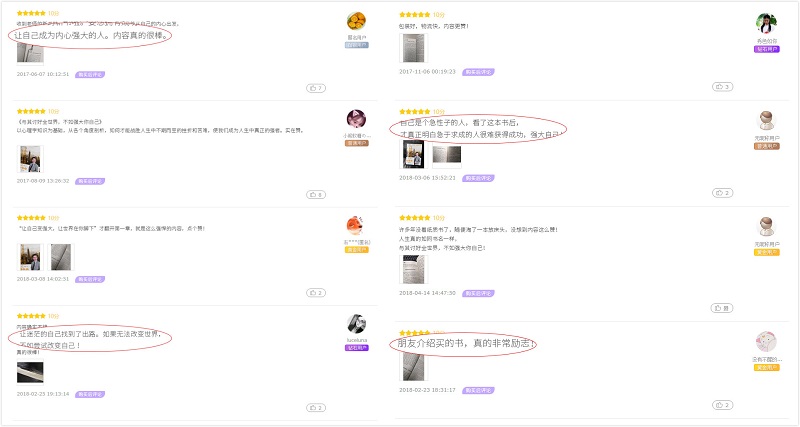 特别是在网络口碑已成为当前图书在线销售重要影响因素的时候,《与其讨好全世界不如强大你自己》一书评论区的好评节节攀升,成为了此书持续火爆热销的一大助力。在出书大师看来,此书更是销量与口碑双管齐下,成为图书市场中一颗闪亮的明星,散发出夺目的光彩。