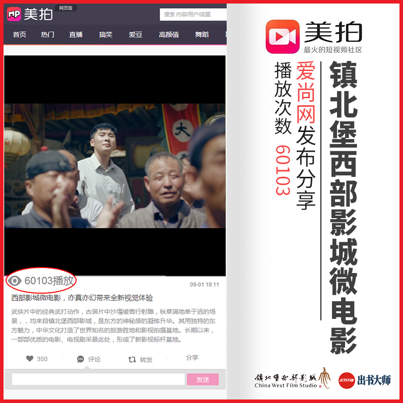 这部短片被很多微博大V和美拍达人所喜爱,一经发布分享,就在互联网上掀起了一阵疯狂转载、热评的浪潮!出书大师网旗下网媒公司合作伙伴——美拍达人“爱尚网”也是被镇北堡西部影城微电影中,那亦真亦幻画面所倾醉,他也分享了这条影片,在短时间一个星期的时间内,网上播放量就突破了六万多人次,并且还在持续增长当中。
