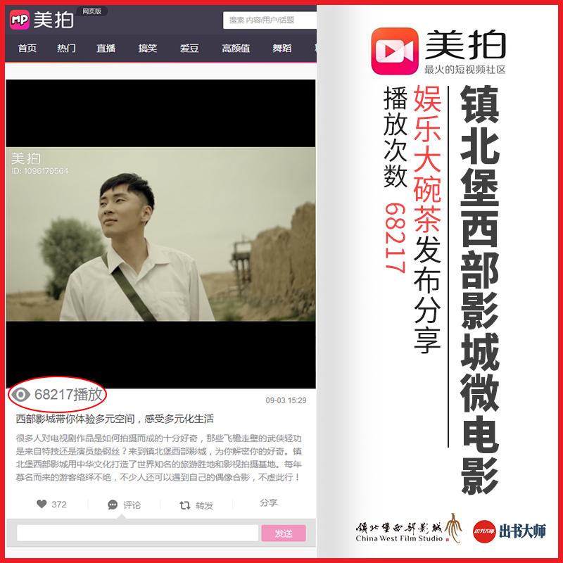 “娱乐大碗茶”是出书大师网旗下网媒公司知名合作伙伴,近日发布分享了张公辅先生自编自导的“镇北堡西部影城微电影”。该影片符合众多影视爱好者和影视导演的审美,一时影片播放量达到68217次,登上了美拍视频热门排行,引发大量网友播放、点赞、分享。