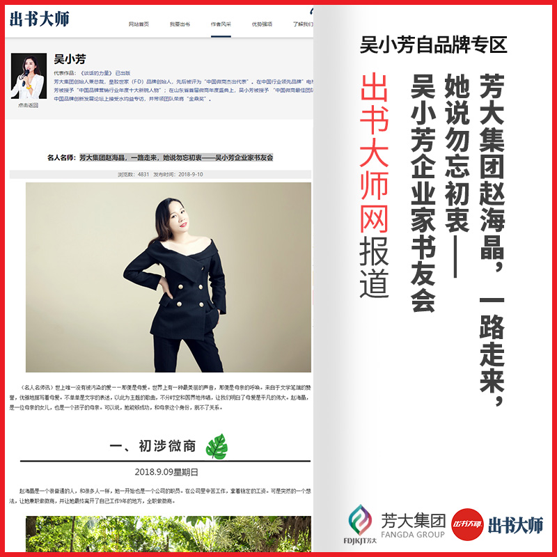 在如今这个竞争异常激烈的社会中,不忘初心的概念已经被太多的人进行解读,但真正能够做到的人却少之又少。在赵海晶的身上、芳大集团和出书大师网的身上,我们又重新看到了这份力量,也正是这份力量,才能真正的“方得始终”。