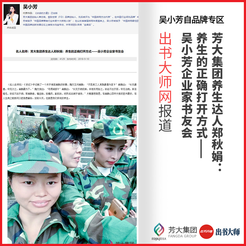在出书大师网的密切关注下,芳大集团郑秋娟的故事也被他们发掘了出来。这家专业的图书策划机构,不但在出版领域享有盛名,更重要的是在书籍出版后为客户的宣传上更是不遗余力,在客户群中拥有着完美的口碑。也正是这一特质,才能在芳大集团这么多的代理中,找到了关于“养生之道”最具代表性的郑秋娟。