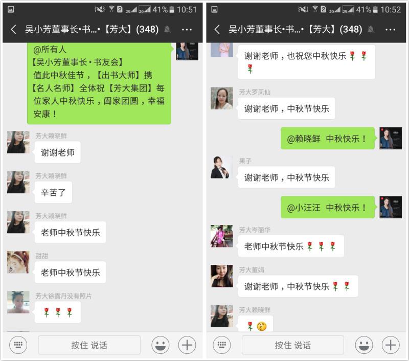 时值中秋佳节之际,一直致力于把芳大集团打造成一个温暖的大家庭的吴小芳总裁也和她的书友会成员们度过了一个温馨、有爱的中秋节。而作为吴小芳总裁的力作——《谈话的力量》一书的全权代理,【出书大师】也在这一天携全体对吴小芳书友会的全体成员们表达了祝福之情!