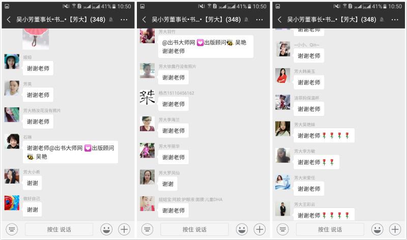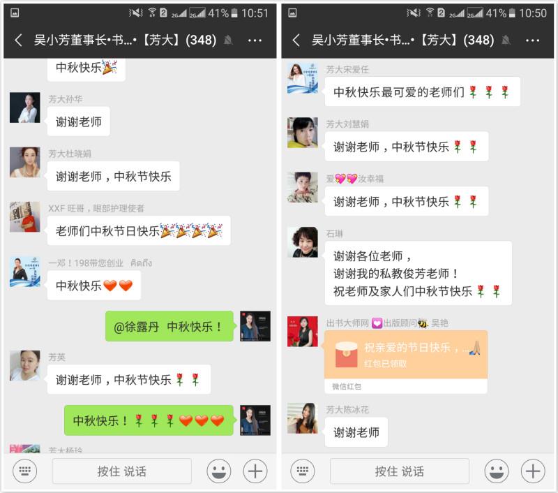 作为【吴小芳董事长·书友会】的微信群里的其中一员,为了能与书友会成员们共度中秋佳节,出书大师网的出版顾问吴艳老师特地在微信群里发了一条代表【出师大师】的充满温暖的祝福短信,短信内容为:“值此中秋佳节,【出书大师】携全体祝【芳大集团】每位家人中秋快乐,阖家团圆,幸福安康”,以此表达了她对芳大集团每位员工的良好祝愿!看到吴艳老师如此用心的短信,书友会成员也都纷纷回复吴艳老师“节目快乐”来表达自己的感谢之情,一时间,整个微信群都被一条条温暖而有力的祝福短信刷新着,洋溢着幸福友爱的气息!看到各位书友会成员都如此的热情,吴艳老师随后又发了一个大大的微信红包,作为自己送给书友会成员们的一点小心意,另一方面也实现了能与书友会成员共庆节日的小愿望。