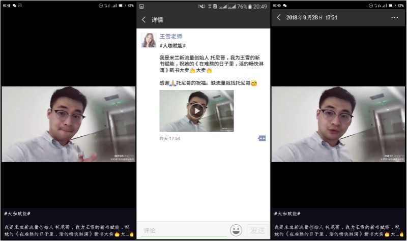 2018年9月28日,来自米兰新流量品牌创始人的托尼哥录制了一个短视频,托尼哥在视频中大力推荐微商操盘手王雪老师著作《在难熬的日子里,活得畅快淋漓》,对新书送来祝福,遥祝王雪老师新书大卖。