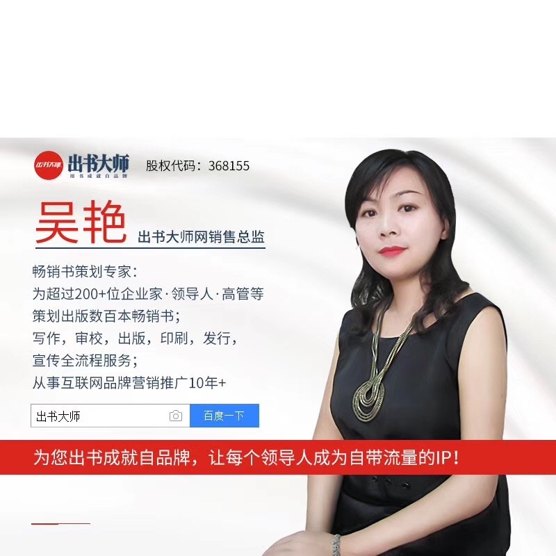 吴艳老师作为出书大师网的销售总监,自走上岗位的那一刻起,就尽心尽力为这个团队服务。她始终背负着工作的责任感和使命感,努力为出书大师网打造不一样的企业形象。身为一名资深的畅销书策划专家,吴艳老师有着长达十年的互联网品牌营销推广经验。她曾经为超过两百位企业家,领导人和行业高管策划出版作品,迄今为止,由吴艳老师策划出版的畅销书已逾百部。尽管如此,吴艳老师却从未有过自我满足,在日常工作中,吴艳老师从来都是负责写作,审校,出版,印刷,发行,宣传等全部流程,尽职尽责为作者提供最好的高水准服务。