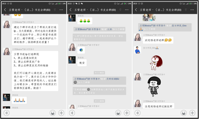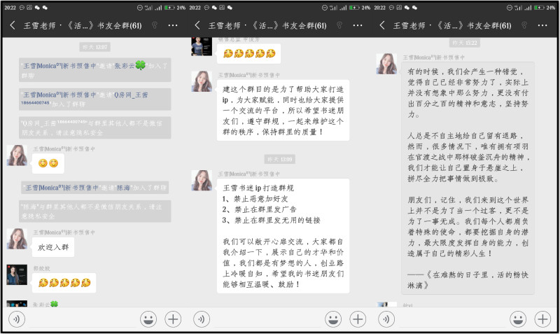 王雪老师在建群之初就确立了书友群的详细用处。她说,这个群的目的主要在于帮助大家打造IP,为大家赋能,与此同时,书友们也可以在这里畅快的表达自己的读书心得,此群的建立也方便了大家的交流,让大家聆听到更多关于这本书的声音。当然,这个群也是需要一些规矩来防范一些不良现象的出现。因此,王雪老师也很明确的告诉了大家这个群的秩序规则。在这个群里。为了避免有人用心叵测,伤害到书友们的合法权益,于是在这个群里禁止恶意加好友,也不许在群里乱发广告,更不能在群里发无用的链接。这些规章制度的建立,不仅有效的保护了群里的网络交流环境,另一方面也让书友们可以在这里真正的体会书里的内容,了解更多对书的理解与想法。