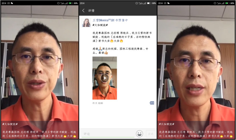 2018年9月28日,粤森园林总经理郭晓兵录制了一个短视频,郭晓兵老师在视频中大力推荐微商操盘手王雪老师著作《在难熬的日子里,活得畅快淋漓》,对新书送来祝福,遥祝王雪老师新书大卖。