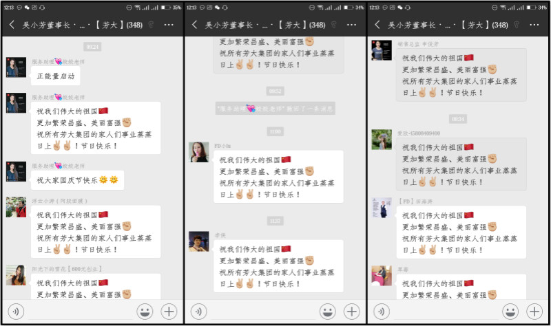 七天的假期,是一年中唯一一次与春节假期时长一样的长假。国庆时,回家过节,与父母、子女团聚,享受亲情,无疑是做好的选择。“常回家看看”,在国庆长假里变得更容易现实。在这样的日子里每一个汉字每一句话都有了独特的含义,在今天每一句祝福都离不开祖国母亲。在【吴小芳董事长·书友会】的微信群里,大家一早就对祖国母亲表达了自己的衷心祝愿:“祝我们伟大的祖国,更加繁荣昌盛、美丽富强;祝所有芳大集团的家人们事业蒸蒸日上!”一条紧接着一条的祝福消息,在此时此刻也体现了一个团队的凝聚力。每个日子里,无论是工作还是假期,芳大集团始终和大家在一起。